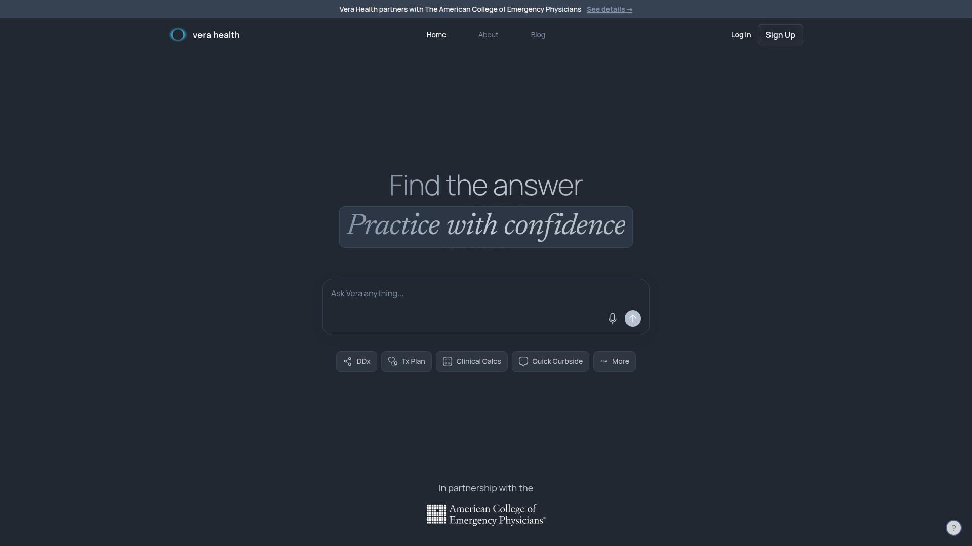 - Emergency medicine partnership context: Vera Health states a partnership with the American College of Emergency Physicians, indicating a strong emphasis on emergency care best practices and policies.