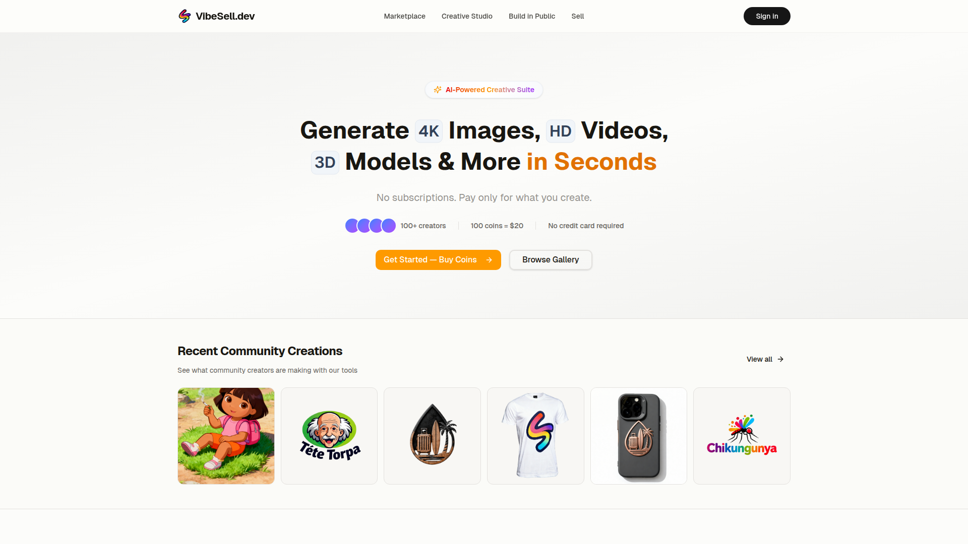 Creative Studio on VibeSell.dev is an AI-powered creation suite for generating visual, audio, and interactive assets, including 4K images, HD videos, 3D models, logos, ad creatives, product mockups, and simple web apps. The product uses a coin-based usage model rather than a subscription, with per-tool generation costs shown on the page.