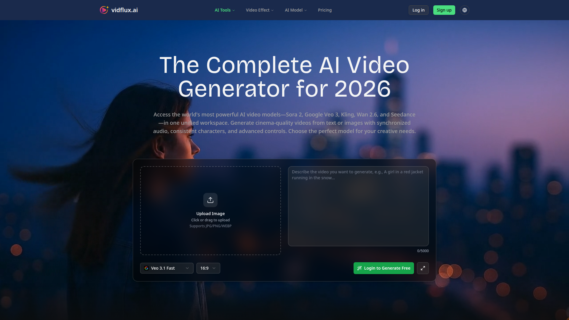 VidFlux is an AI video generation platform that brings several named video models into one workspace, including Sora 2, Google Veo 3, Kling, Wan 2.6, Seedance, and Grok Imagine. It supports both text-to-video and image-to-video workflows, with the page emphasizing cinematic output, synchronized audio, character consistency, and creative controls.