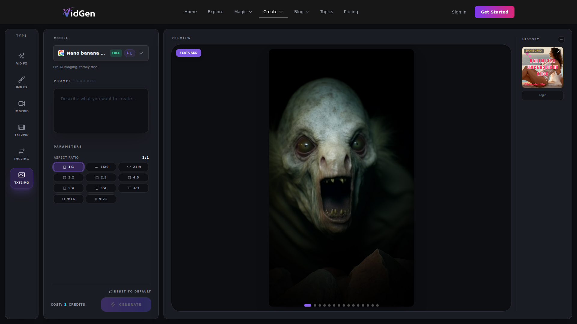 The product appears to serve creators who want to generate fictional, consensual visual content and explore AI-assisted art and effects workflows. Its positioning is likely a self-serve creative generation platform with both free and paid tiers, although the page provides only limited detail about how each model or mode differs in practice.