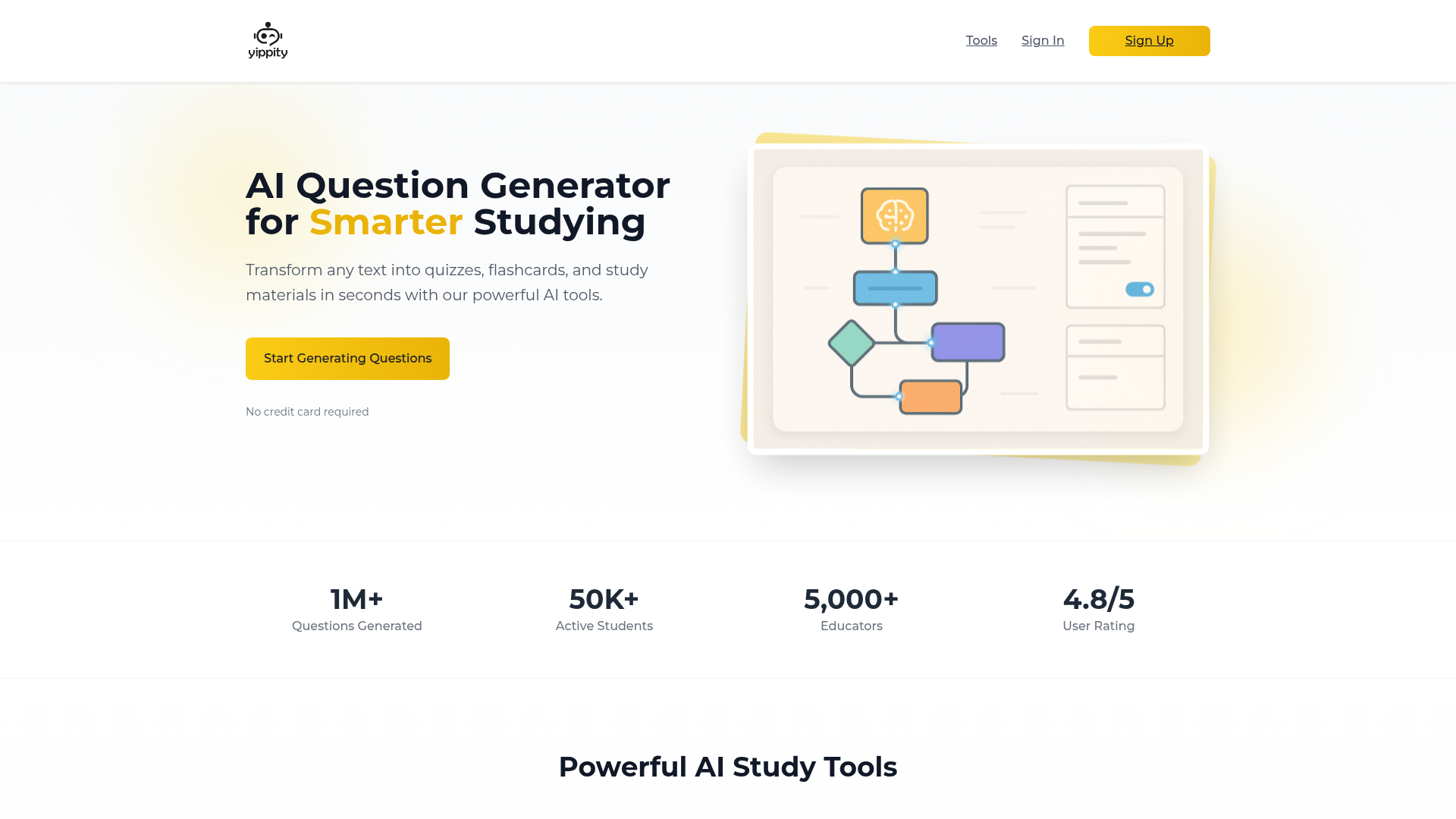 Its core workflow appears to be: provide text, generate question sets or study assets, review them in an editor, then organize, export, share, or use them for practice. The product is positioned as a lightweight AI productivity tool for learning and teaching, with both prebuilt study tools and a broader no-code custom-tool builder.