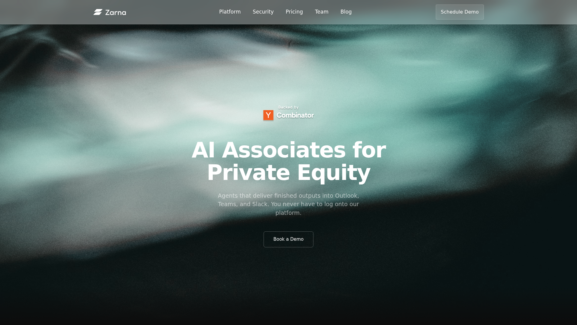 Zarna is an AI associate platform built for private equity deal teams. It captures deal data from sources such as emails, CIMs, CRM records, meetings, attachments, and VDR-related materials, structures and cleans that data, and then uses role-based agents to generate work products and deliver them into tools teams already use, including Outlook, Teams, and Slack.