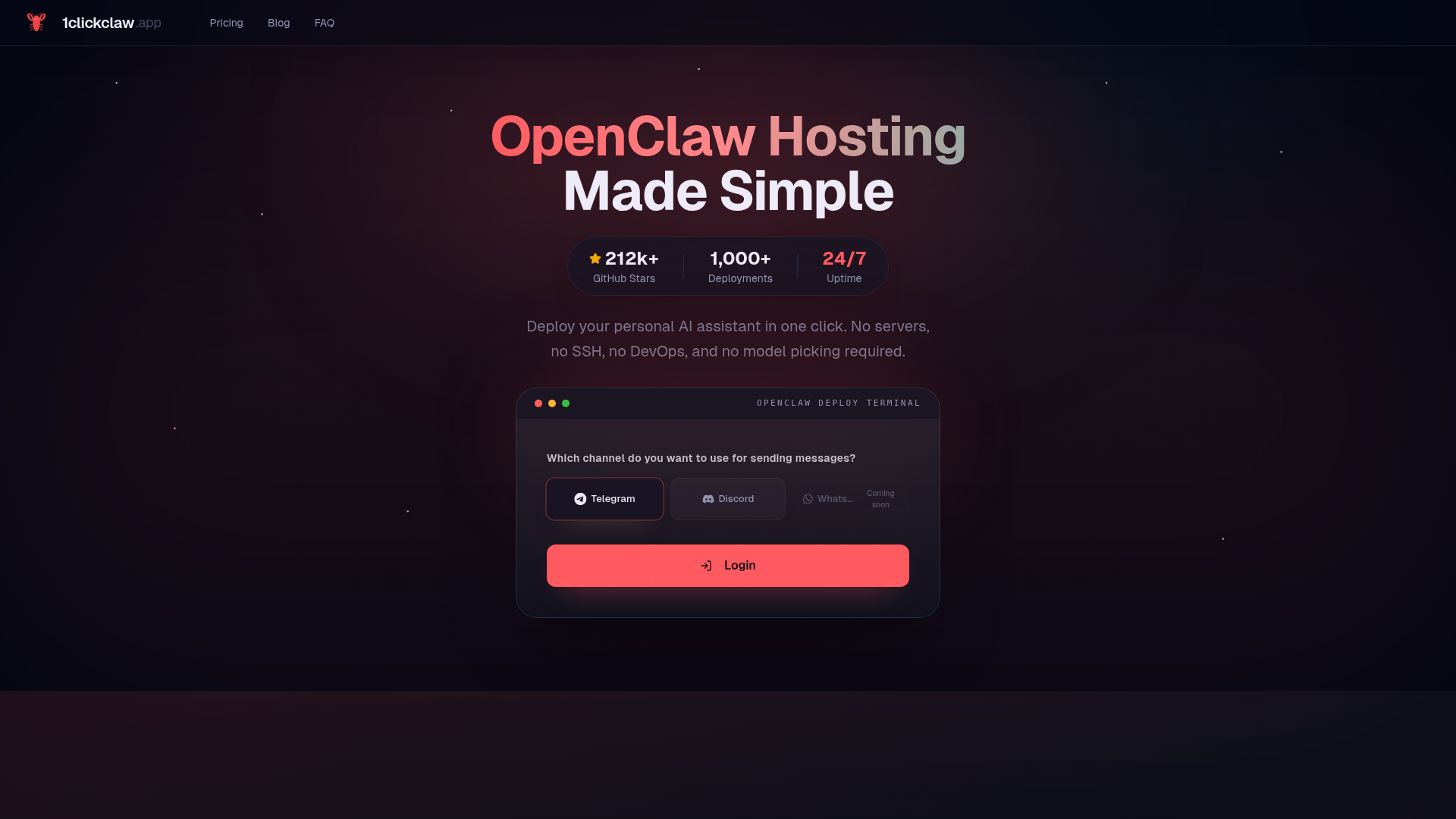 1ClickClaw es un servicio de despliegue alojado para OpenClaw que convierte la configuración en un breve flujo de dos pasos: conectar un canal de mensajería y luego lanzar el asistente en un servidor en la nube dedicado. La página lo presenta como una forma de ejecutar un asistente personal de IA sin tener que gestionar servidores, SSH, instalación de dependencias, SSL, configuración de dominio ni selección de modelos.