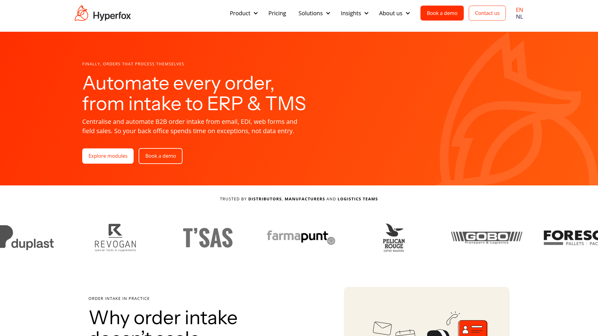 Hyperfox es un software de automatización de pedidos B2B para equipos de distribución, fabricación, almacenamiento y logística. Centraliza la entrada de pedidos desde canales como correo electrónico, EDI, formularios web, portales de clientes y ventas de campo, y luego valida y enruta esos pedidos hacia entornos ERP o TMS.