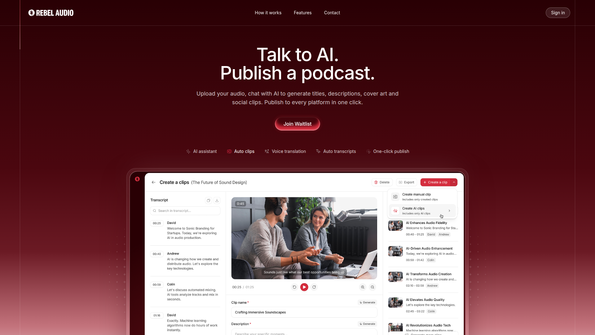 Rebel Audio es una plataforma de pódcast social asistida por IA para creadores que quieren convertir audio o video en bruto en episodios de pódcast listos para publicar y recursos promocionales con una edición manual mínima. Según la página, su flujo de trabajo se centra en tres pasos: subir un archivo, chatear con un asistente de IA para generar materiales del episodio y publicar en múltiples plataformas desde una sola interfaz.