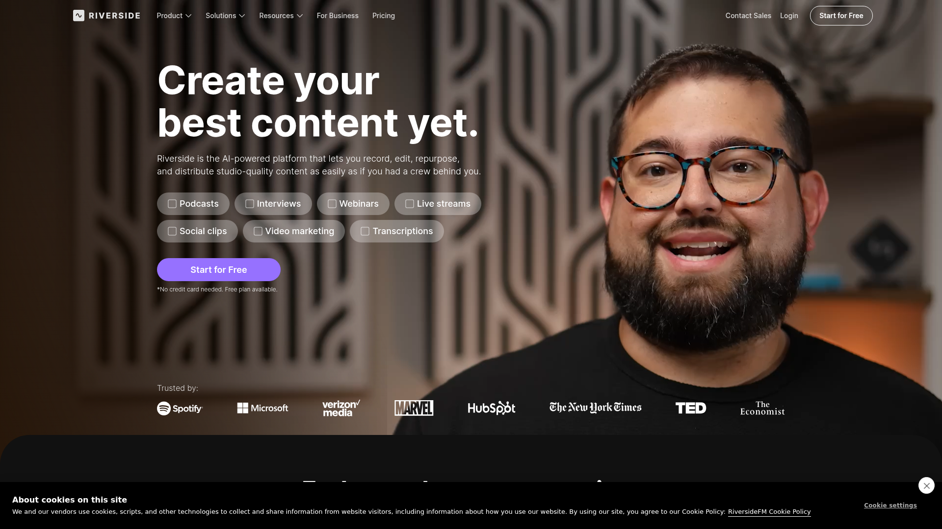 Riverside es una plataforma impulsada por IA para grabar, editar, reutilizar, transmitir y publicar contenido de pódcast y video en un solo flujo de trabajo. Parece estar orientada a podcasters, productores, profesionales de marketing y equipos que realizan entrevistas, seminarios web, transmisiones en vivo y programas de video marketing.