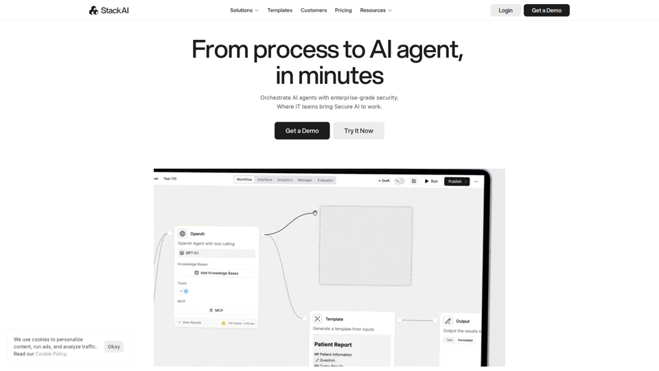 StackAI es una plataforma empresarial de agentes de IA que ayuda a las organizaciones a crear, implementar y gestionar flujos de trabajo agénticos y aplicaciones de IA seguros y conformes, principalmente para equipos de TI y de arquitectura empresarial. Para los equipos de TI, operaciones, cumplimiento, finanzas y servicios, puede transformar procesos manuales en flujos de trabajo de IA gobernados que funcionan dentro de los sistemas existentes y respaldan el uso en producción.