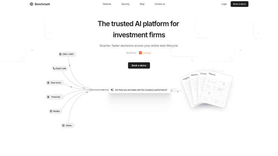Benchmark es un espacio de trabajo impulsado por IA para firmas de inversión que ayuda a los equipos a acelerar la diligencia, automatizar tareas repetitivas y convertir archivos como Excel, PDF y transcripciones de llamadas en información accionable sobre operaciones a lo largo del ciclo de vida de la operación. Para profesionales de capital privado, crédito privado, bienes raíces, growth equity y capital de riesgo, los resultados de IA con citas y los flujos de trabajo estandarizados pueden mejorar la velocidad y la consistencia en la evaluación inicial, la revisión de riesgos, la elaboración de informes y el monitoreo de cartera.