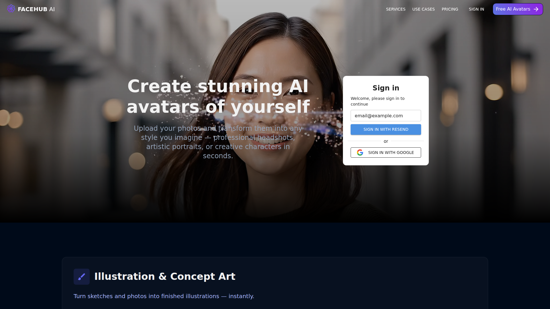 FaceHub AI est une plateforme de génération d’images et d’avatars par IA qui transforme des photos téléchargées, des croquis, des références de style et des prompts en portraits, illustrations, photos retouchées, visuels produits et scènes réunissant plusieurs personnes. Le site la présente comme un outil rapide et en libre-service permettant de créer en quelques secondes des rendus visuels haute fidélité, pour des usages personnels comme commerciaux.