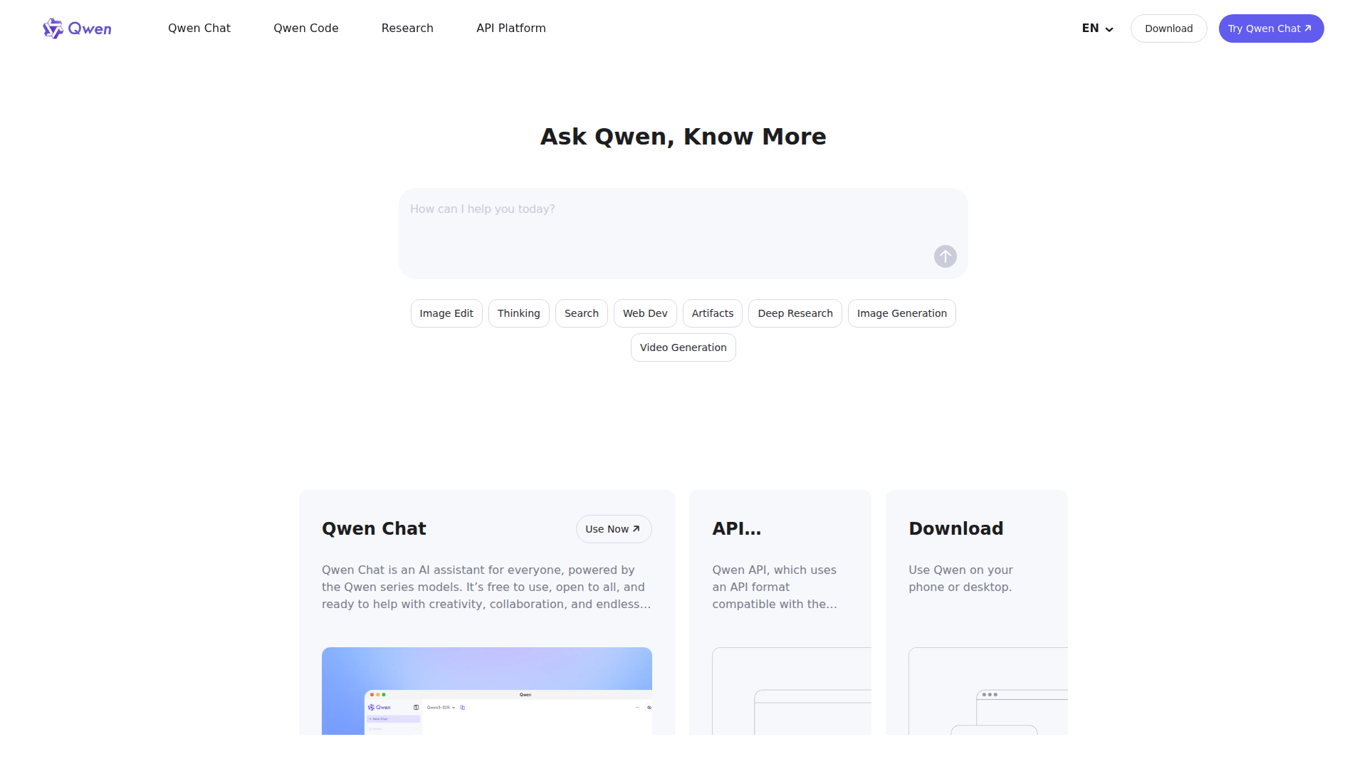 Qwen Chat est un assistant IA polyvalent construit sur la série de modèles Qwen. Il est présenté comme gratuit et largement accessible, avec une prise en charge de la créativité, de la collaboration, de la recherche, du raisonnement, de l’investigation, du développement web, de la génération d’images et de la compréhension multimodale à travers le texte, les images, l’audio et la vidéo.