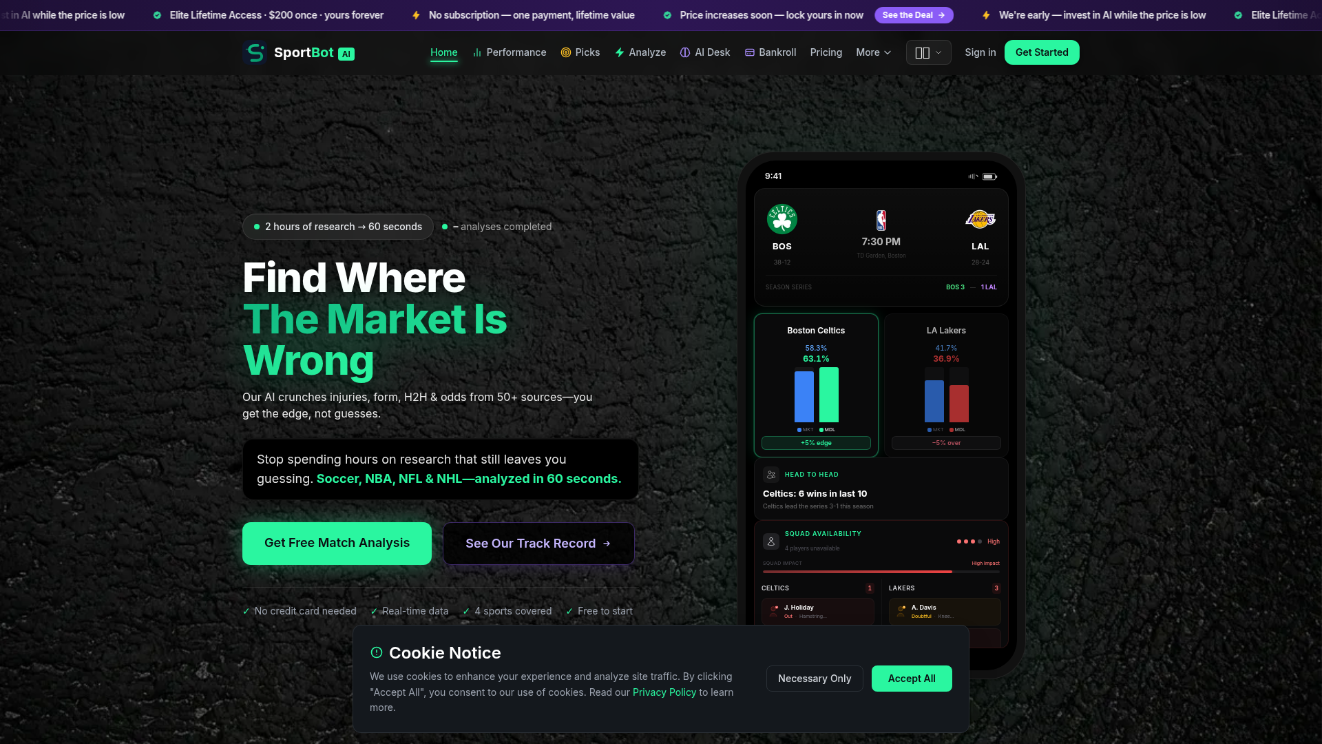 SportBot AI est un produit d’analyse sportive basé sur l’IA, axé sur la recherche avant match et les flux de travail de paris à valeur. Il analyse la forme des équipes, les blessures, l’historique des confrontations directes et les cotes des bookmakers provenant de plus de 50 sources afin d’estimer les probabilités de victoire, de comparer ces estimations aux prix du marché et de mettre en évidence d’éventuels écarts de tarification.