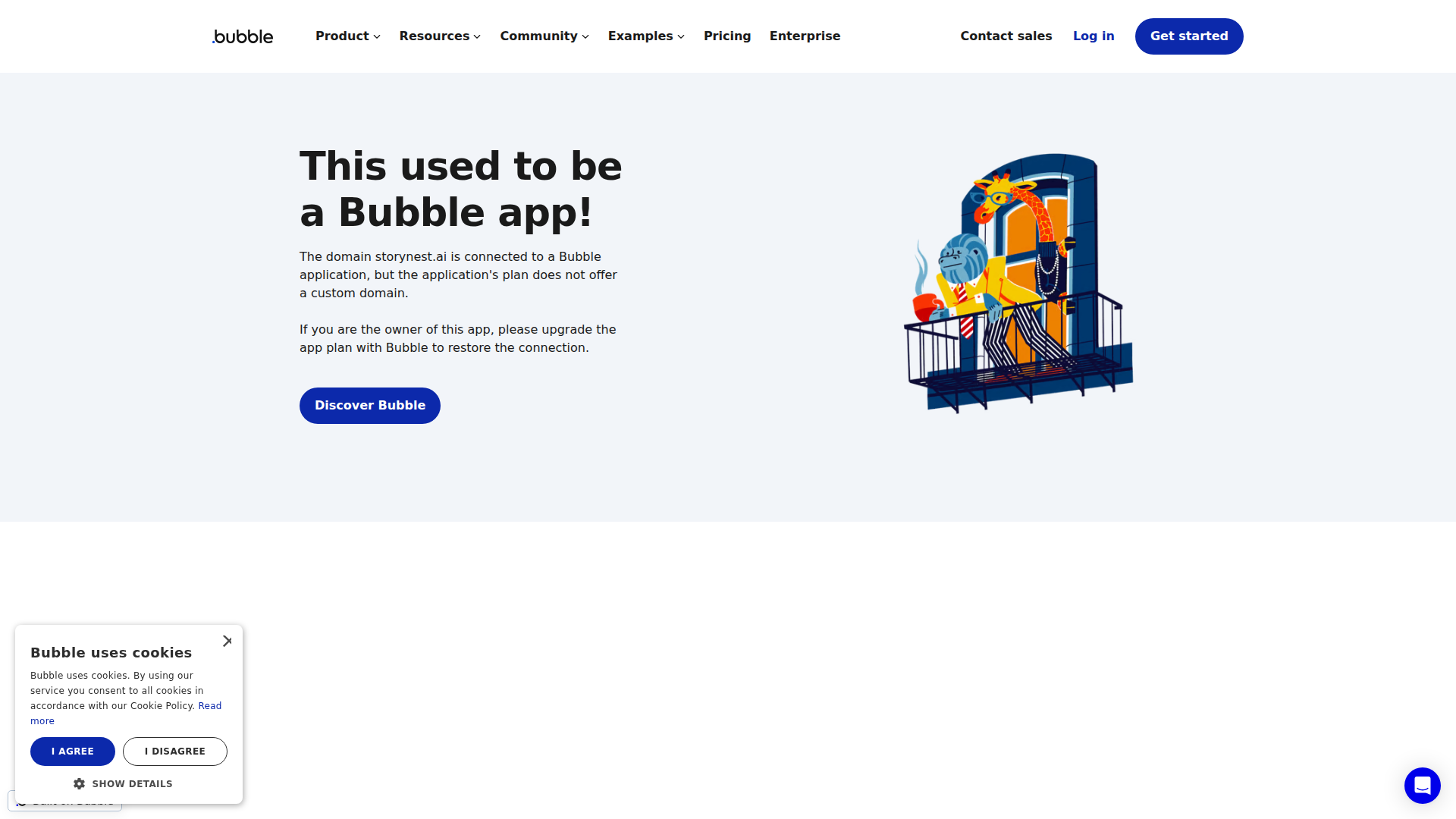 La page disponible n’affiche pas le véritable produit Storynest.ai. Elle montre un avis d’hébergement Bubble indiquant que le domaine est connecté à une application Bubble, mais que le forfait actuel de l’application ne prend pas en charge un domaine personnalisé ; le site n’est donc pas accessible depuis cette URL.