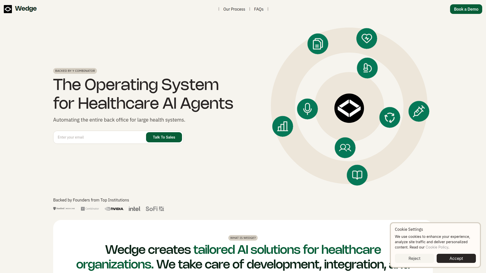 Son flux de travail est consultatif et structuré par département : Wedge audite les processus du personnel, identifie les opportunités d’automatisation, associe chaque agent à un ROI attendu, personnalise le déploiement avec des ingénieurs sur site, puis étend l’automatisation à d’autres départements administratifs au sein d’un système unique. Le produit est positionné comme une couche d’opérations IA spécifique à la santé plutôt qu’une solution ponctuelle à usage unique.