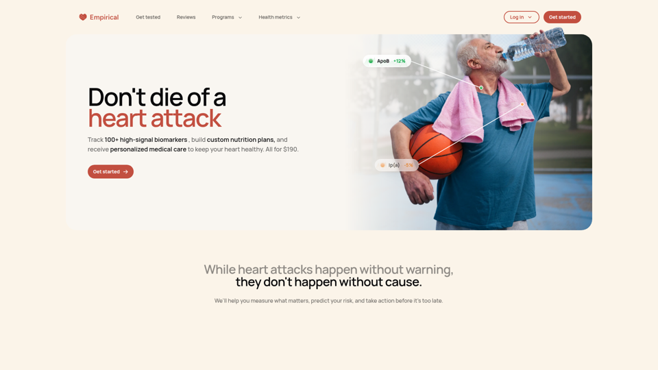 Empirical Health est une plateforme de dépistage et de prise en charge de la santé cardiaque qui aide les adultes à évaluer leur risque cardiovasculaire grâce à plus de 100 biomarqueurs, à la prédiction du risque et à des plans personnalisés de nutrition, d’exercice et de traitement encadrés par des médecins. Pour les professionnels de la prévention et de la cardiologie, elle peut favoriser une intervention plus précoce et éclairée par les données en combinant les résultats d’analyses, le suivi longitudinal et la planification individualisée des soins dans un seul flux de travail.