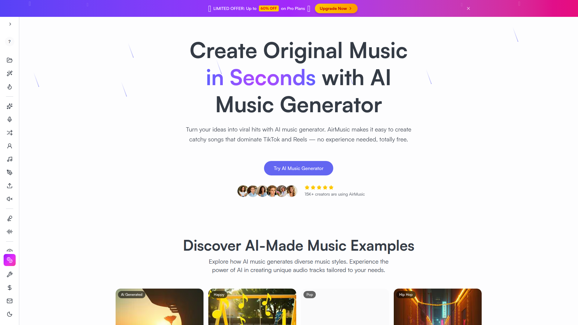 AirMusic は、オンラインでオリジナル音楽を生成するための AI 搭載音楽制作プラットフォームです。従来の音楽制作経験がなくても、高速な音楽制作、編集、変換ワークフローを必要とするコンテンツ制作者、ミュージシャン、マーケター、ポッドキャスター、その他のユーザーに対応しているようです。