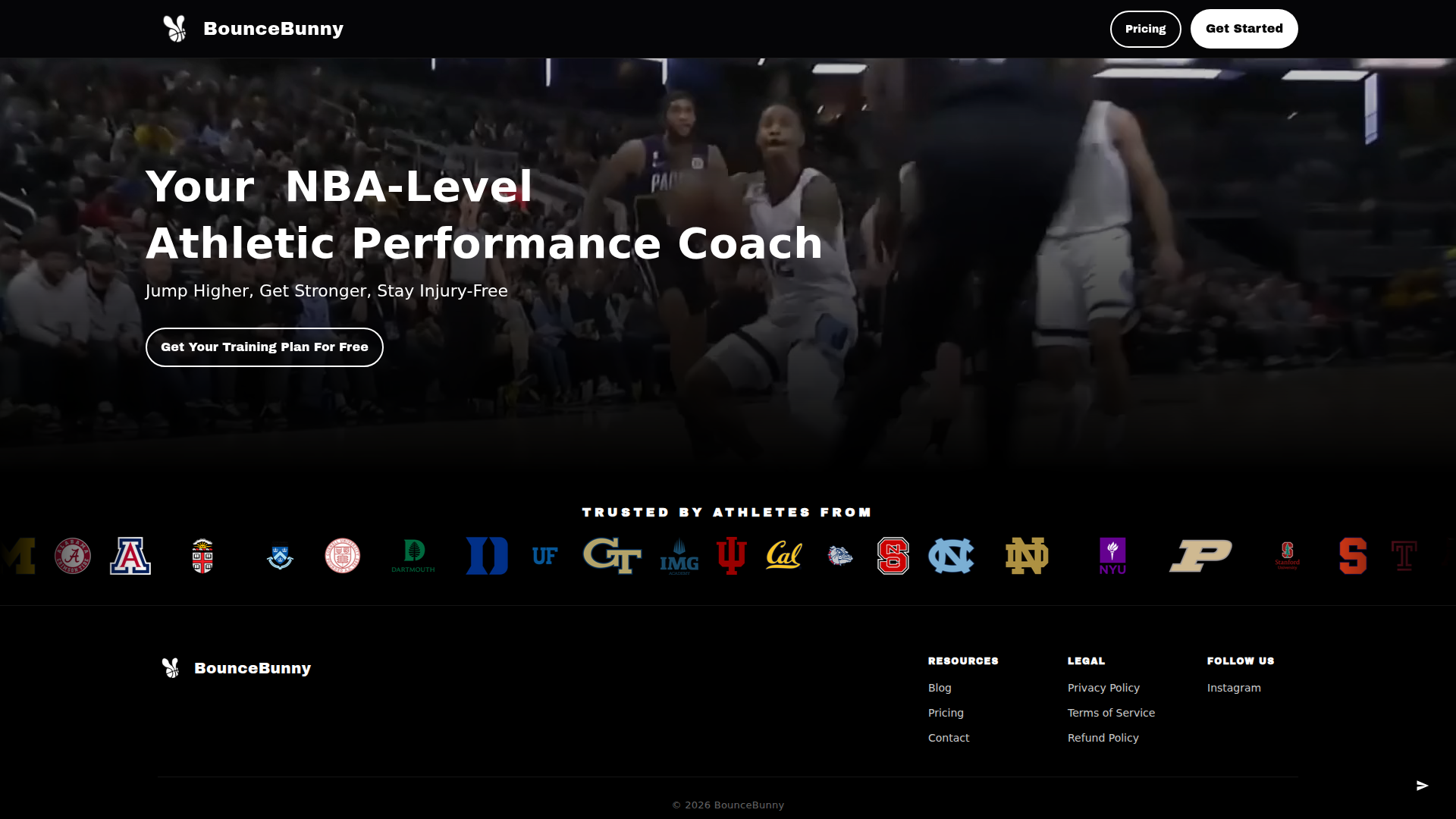 BounceBunny は、バスケットボール系の爆発的パフォーマンス向上を軸に位置づけられたアスレチック・パフォーマンス指導プロダクトです。ページ内容に基づくと、トレーニングプランを通じて、より高く跳ぶこと、より強くなること、そしてケガのリスクを下げることを支援することに重点を置いています。