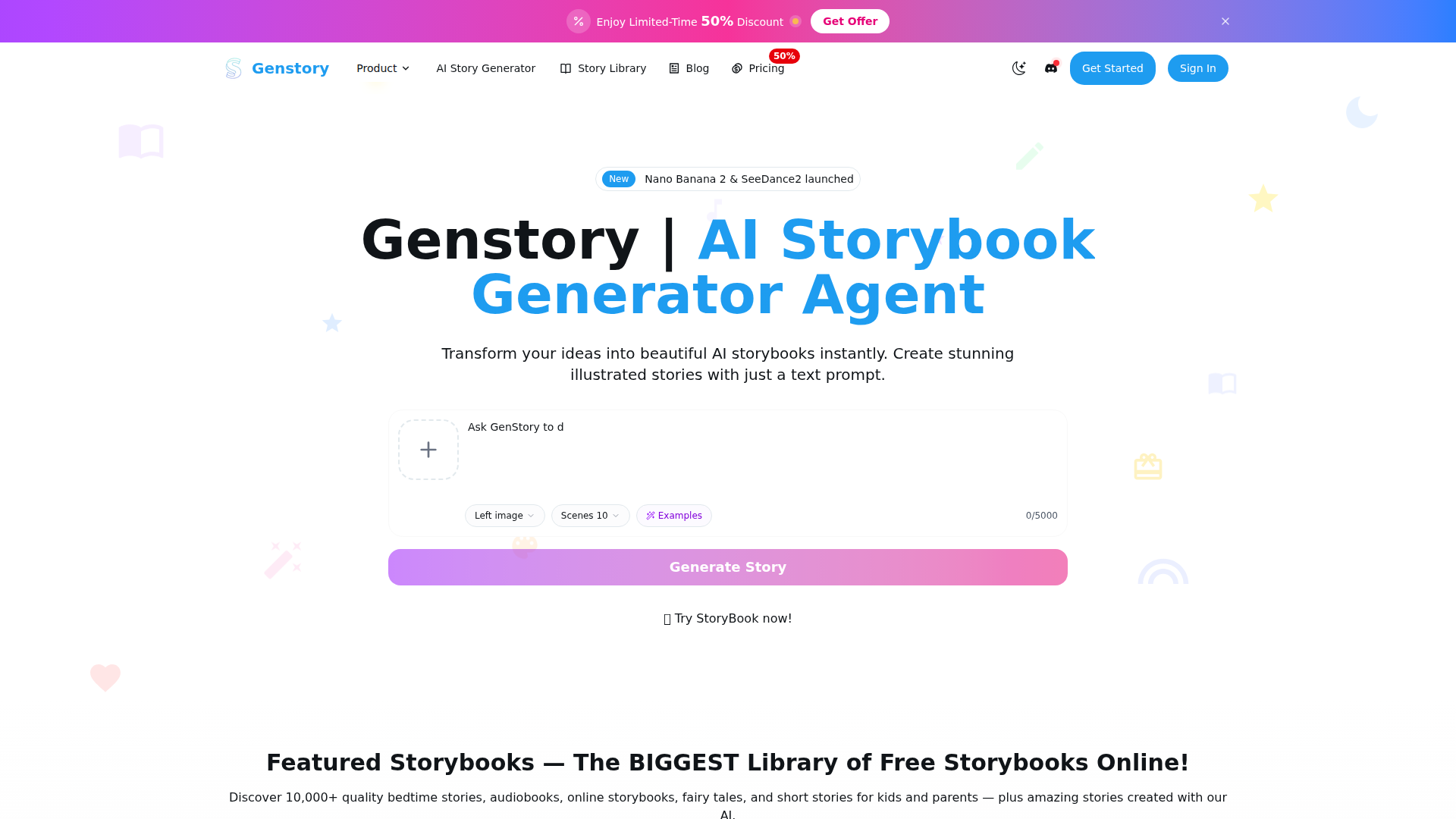 GenStoryは、テキストプロンプトをイラスト付きのデジタル絵本に変換するAI絵本生成ツールです。このページでは、文章による物語とAI生成アートワークの両方を含むストーリーを無料で作成できるツールとして紹介されており、閲覧や読書ができる大規模な公開絵本ライブラリも備えています。