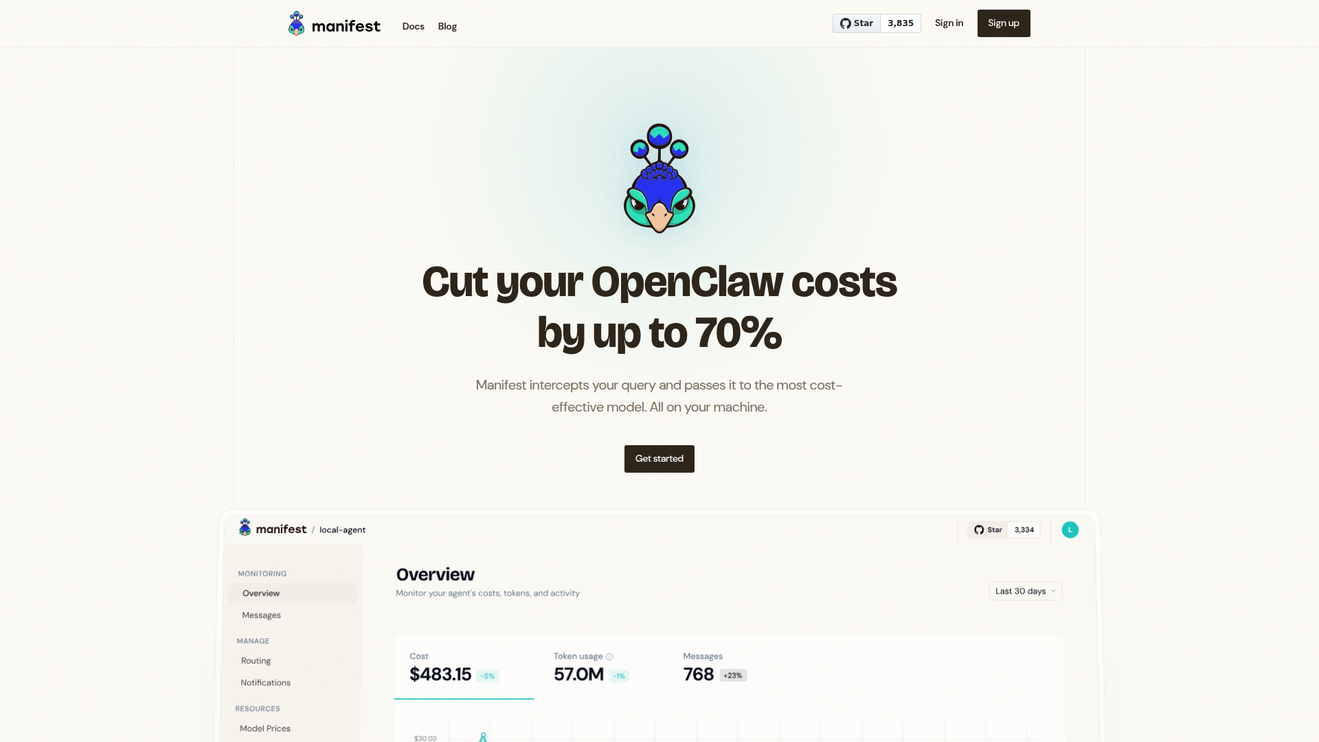 Manifest は OpenClaw 向けのオープンソース LLM ルーターで、リクエストを傍受し、各クエリをよりコストに適したモデルへ振り分けます。この製品は、単純なタスクに大規模モデルを使わないことで、不必要なモデル利用コストを削減することを主眼に据えています。