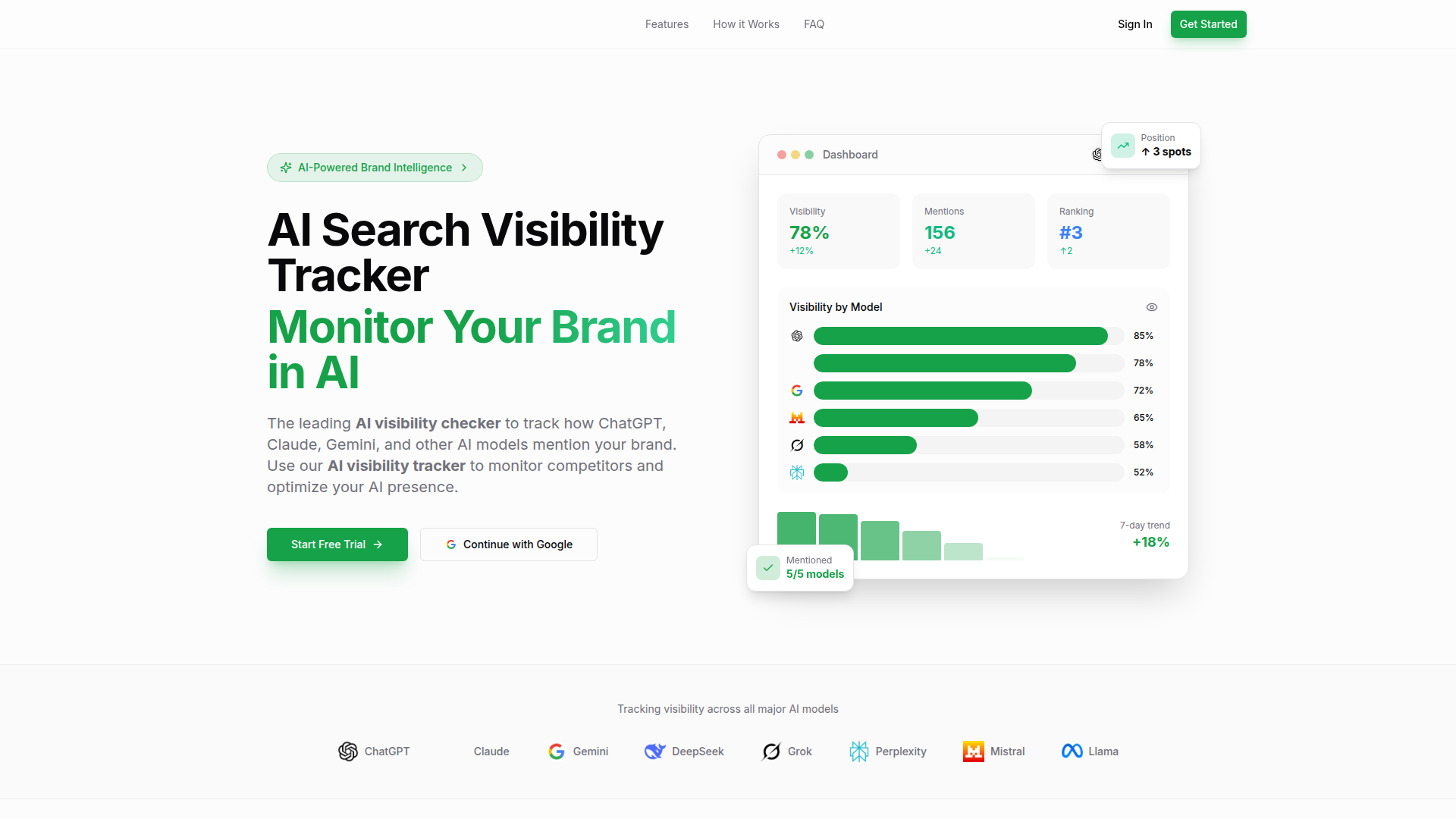 - マルチモデル可視性トラッキング: ChatGPT、Claude、Gemini、DeepSeek、Grok、Perplexity、Mistral、Llama などのモデル全体でブランドがどのように表示されるかを監視し、チームがプラットフォームごとの掲載状況を比較できるようにします。