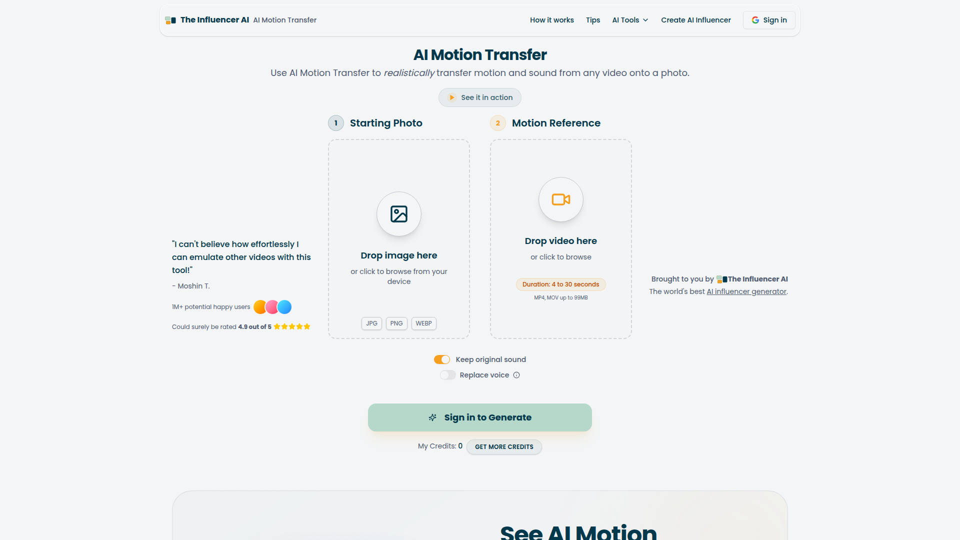 AI Motion Transfer は、The Influencer AI の機能のひとつで、参照動画の動きを画像に転写することで、静止写真をアニメーション化します。ワークフローはシンプルで、キャラクター写真をアップロードし、4〜30秒の動画をアップロードし、元の音声を保持するか音声を差し替えるかを選び、モーションベースの動画を生成します。