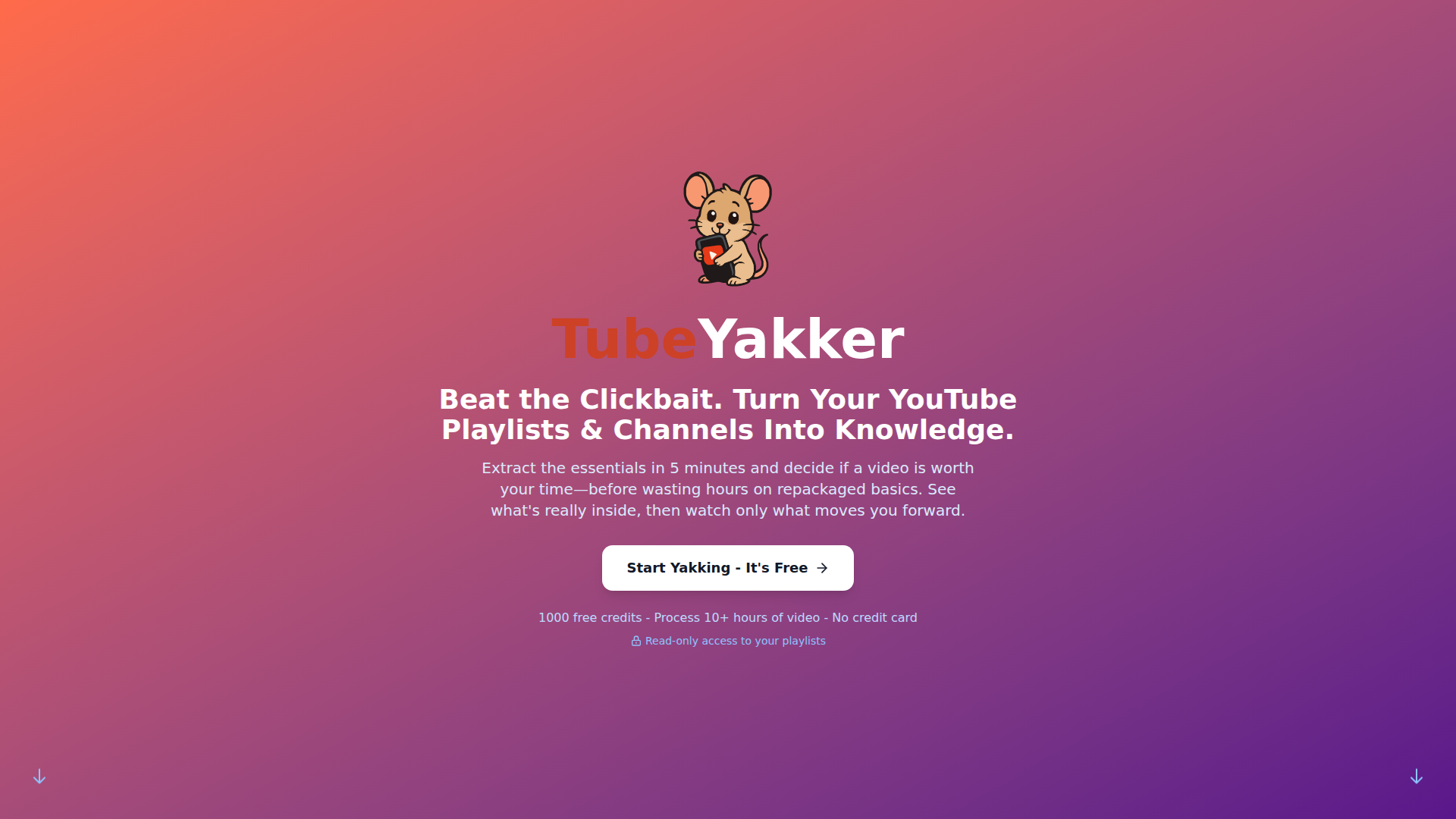 TubeYakker は、YouTube の文字起こしを要約し、チャットできるツールであり、プレイリストやチャンネル登録を検索可能で把握しやすい知識へと変換することを目的に設計されています。保存した動画をより速く見直し、動画全体を視聴する前に内容を把握し、文字起こしベースの要約や質疑応答を通じて特定の場面を再確認できるよう支援することに重点を置いています。