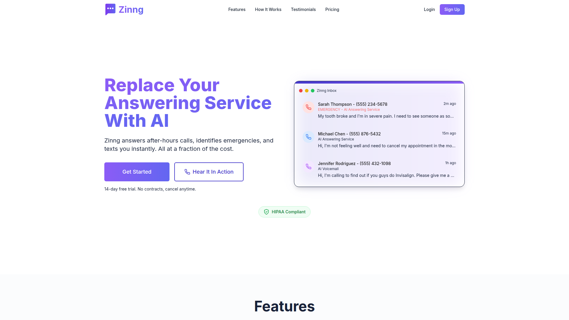 Zinng は、営業時間外や終日を通じて着信対応が必要な企業向けの AI 電話応答プラットフォームです。従来の電話代行サービスの代替として位置づけられており、通話への応答、緊急性の判定、SMS アラートの送信、各会話の記録提供に重点を置いています。