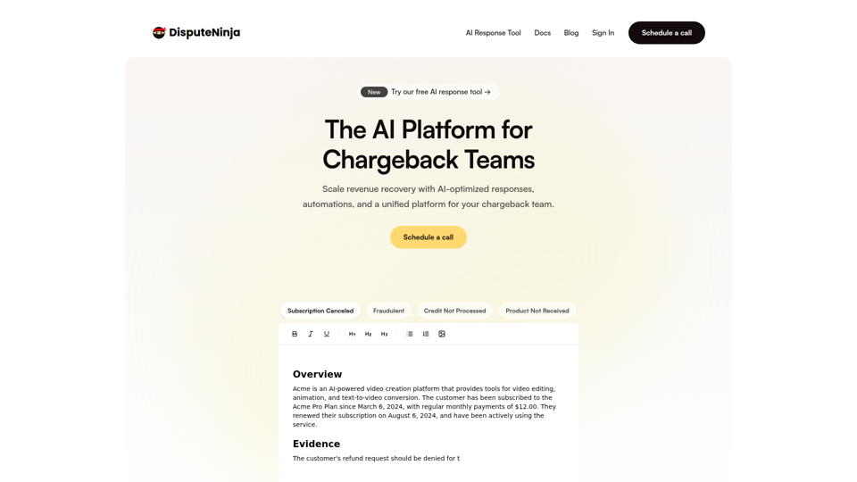 DisputeNinjaは、証拠収集の自動化、異議申し立ての説明文の作成、そして個別最適化されたチャージバック対応の生成を通じて、アナリストによる売上回収の拡大を支援する、チャージバックチーム向けのAIプラットフォームです。チャージバックアナリストや売上回収業務において、手作業による案件構築の負担を軽減し、同じ人員のままでより多くの異議申し立てに対応できるよう支援します。