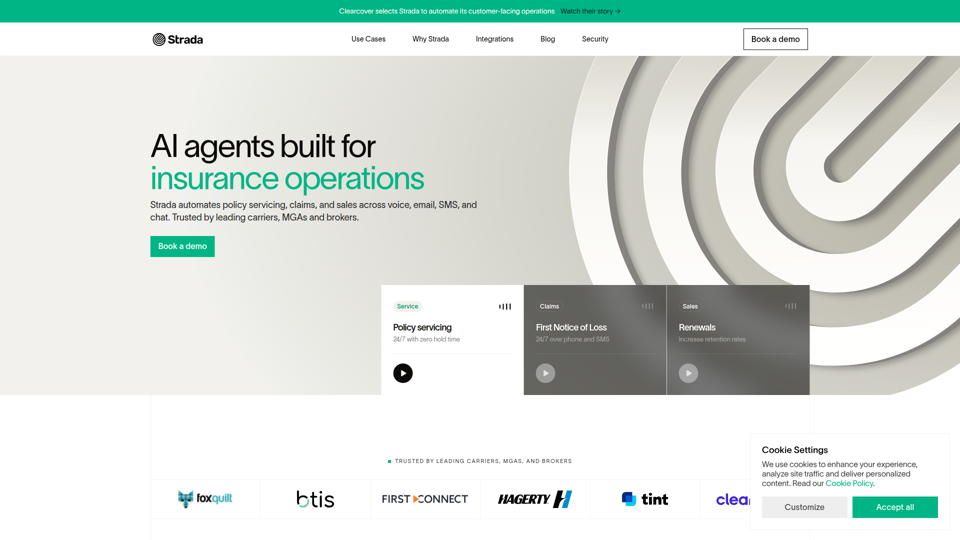 Strada は、保険会社、MGA、ブローカー向けの AI プラットフォームであり、電話、メール、SMS、チャットを通じて、保険契約のサービス業務、保険金請求の受付、更新手続き、営業会話を自動化します。保険業務、カスタマーサービス、保険金請求チーム向けに、定型的な顧客対応をリアルタイムで処理しつつ、複雑な案件は文脈を付してエスカレーションすることで、手作業による対応を削減できます。