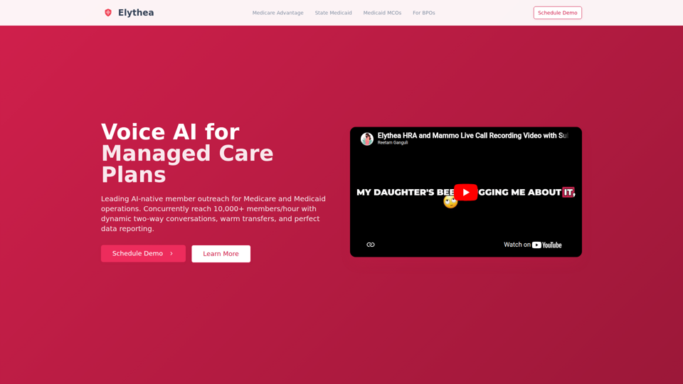 Elythea は、HIPAA および SOC 2 に準拠した音声 AI プラットフォームであり、Medicare Advantage プラン、州の Medicaid 機関、Medicaid MCO、BPO 向けに、ウェルカムコール、再認定リマインダー、品質ギャップ対応、調査、ウォームトランスファーと詳細レポートを伴うスケジューリングを含む、大規模な双方向の会員アウトリーチを自動化します。ケアマネジメント、品質管理、オペレーションの各チーム向けに、AI を活用して、アプローチが難しい集団に対する文化的配慮のあるエンゲージメントを拡大しながら、手作業によるコール業務の負荷を軽減し、プログラム実行を加速できます。