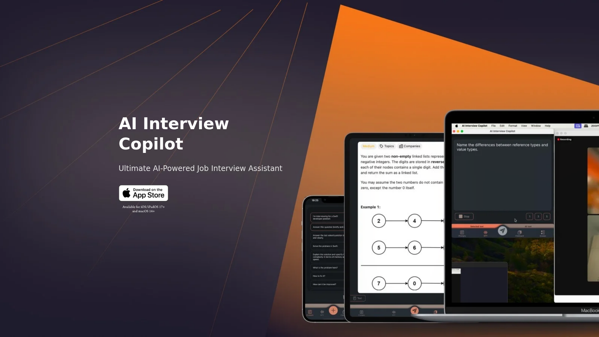 该产品似乎被定位为适用于 Apple 设备的轻量级、实时面试副驾工具,采用可尽量减少打字的简洁控制方式。其最明确的使用场景是帮助用户应对编程和算法问题:通过转写对话、分析视觉提示,并快速生成回答或代码片段。