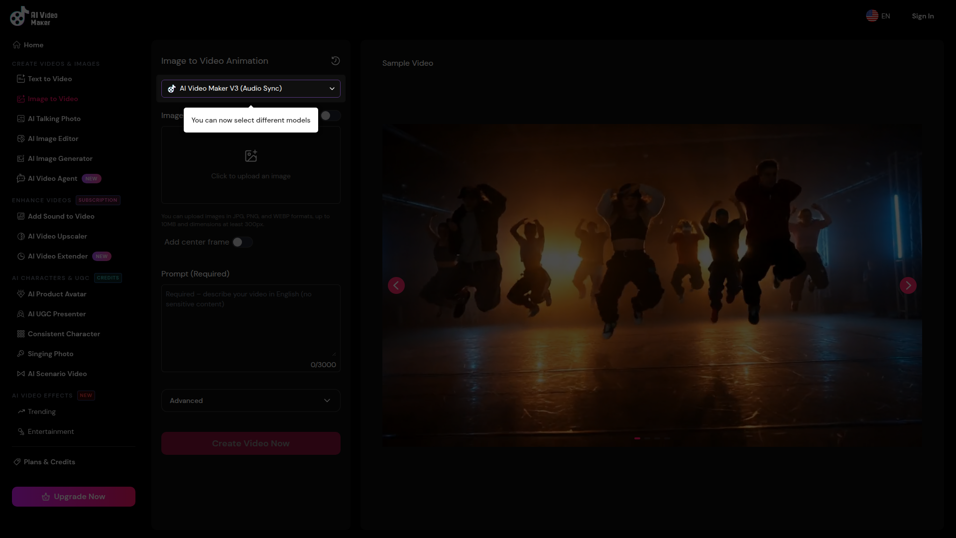 - 图生视频生成:上传 JPG、PNG 或 WEBP 图片,通过文本描述运动或动作,将其转换为动画视频。