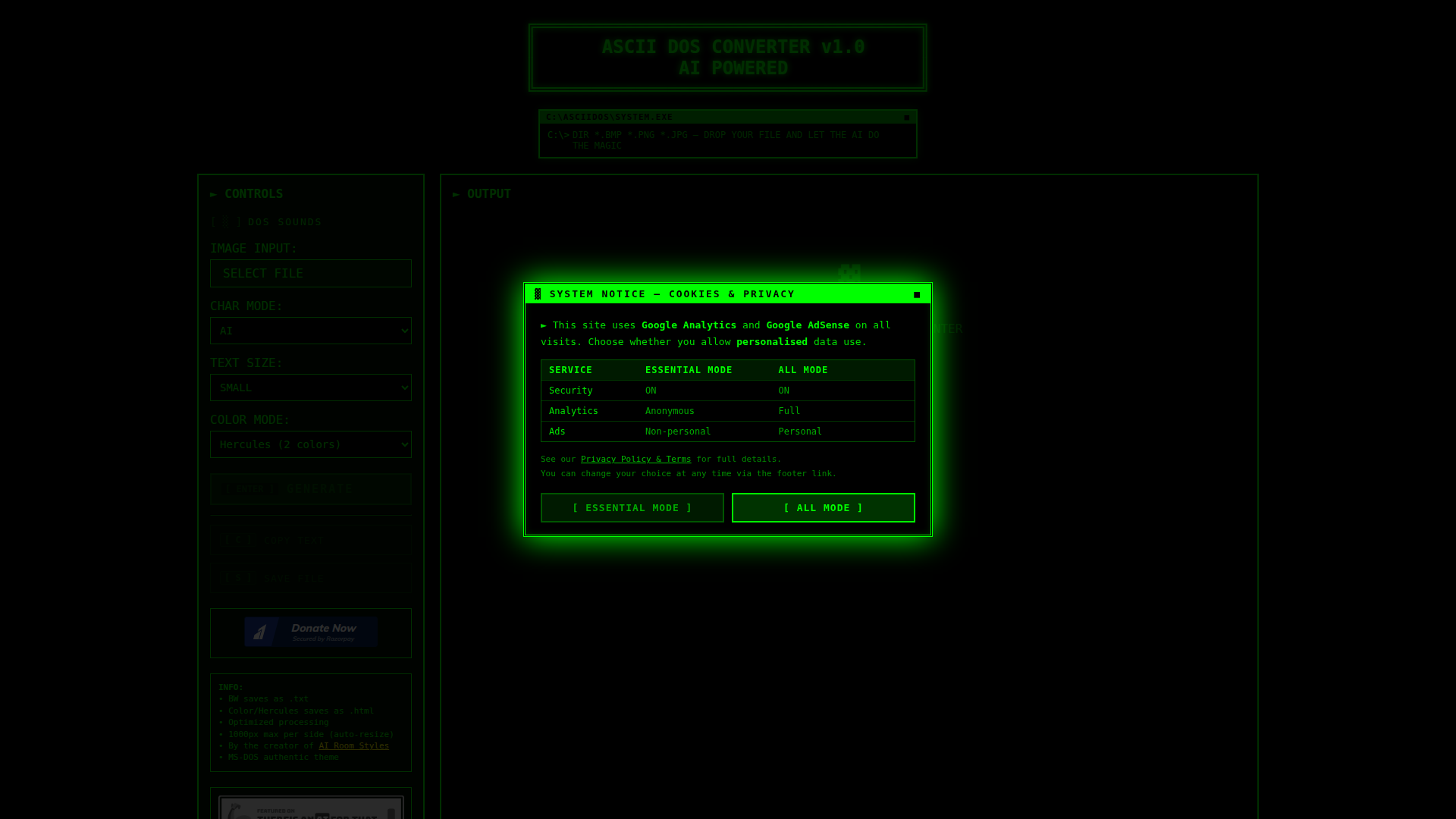 ASCII Art Converter 是一款基于浏览器的图像转 ASCII 工具,采用 MS-DOS 风格界面呈现。它似乎面向希望将 BMP、PNG 或 JPG 图像转换为基于文本或彩色 ASCII 输出的用户,并提供 AI 或经典字符渲染选项。