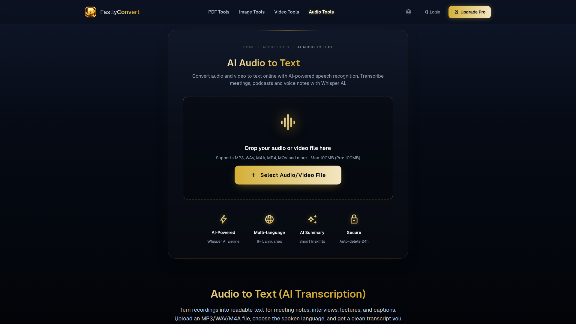 该产品似乎定位为 FastlyConvert 更广泛文件转换套件中的通用型自助工具。其核心流程较为直接:上传音频或视频文件,选择或自动检测语言,可选生成摘要或翻译,然后查看、复制、编辑,或将转录内容导出为文本或字幕格式。