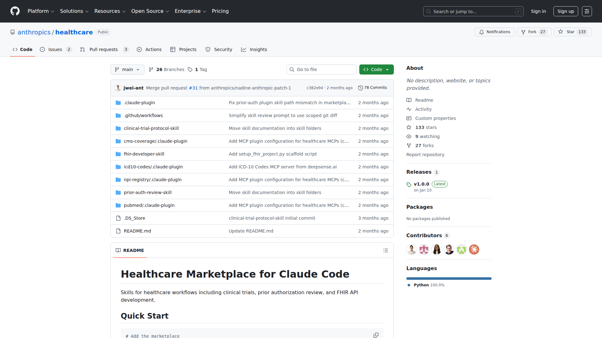 Anthropic Healthcare 是一个托管在 GitHub 上、面向 Claude Code 医疗保健工作流技能的市场型仓库。它为处理医疗数据交换、事前授权审核和临床试验方案起草的团队打包了特定领域能力,并可选择接入面向医疗保健的 MCP 服务器。
