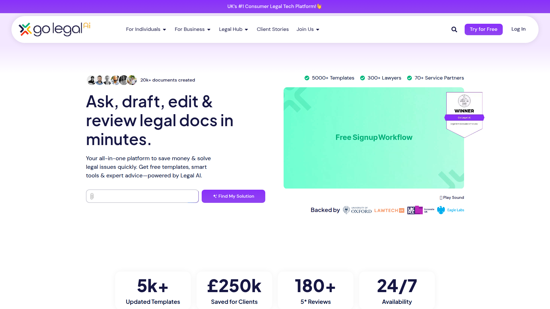 Go Legal AI 是一个面向个人和企业的法律科技平台,集成了文档模板、AI 辅助起草与审查、法律指导内容,以及律师和服务提供商接入。网站将其定位为一个一体化环境,用于创建、编辑、审查、协作处理并签署法律文件,同时还提供面向企业的业务风险监控工具。