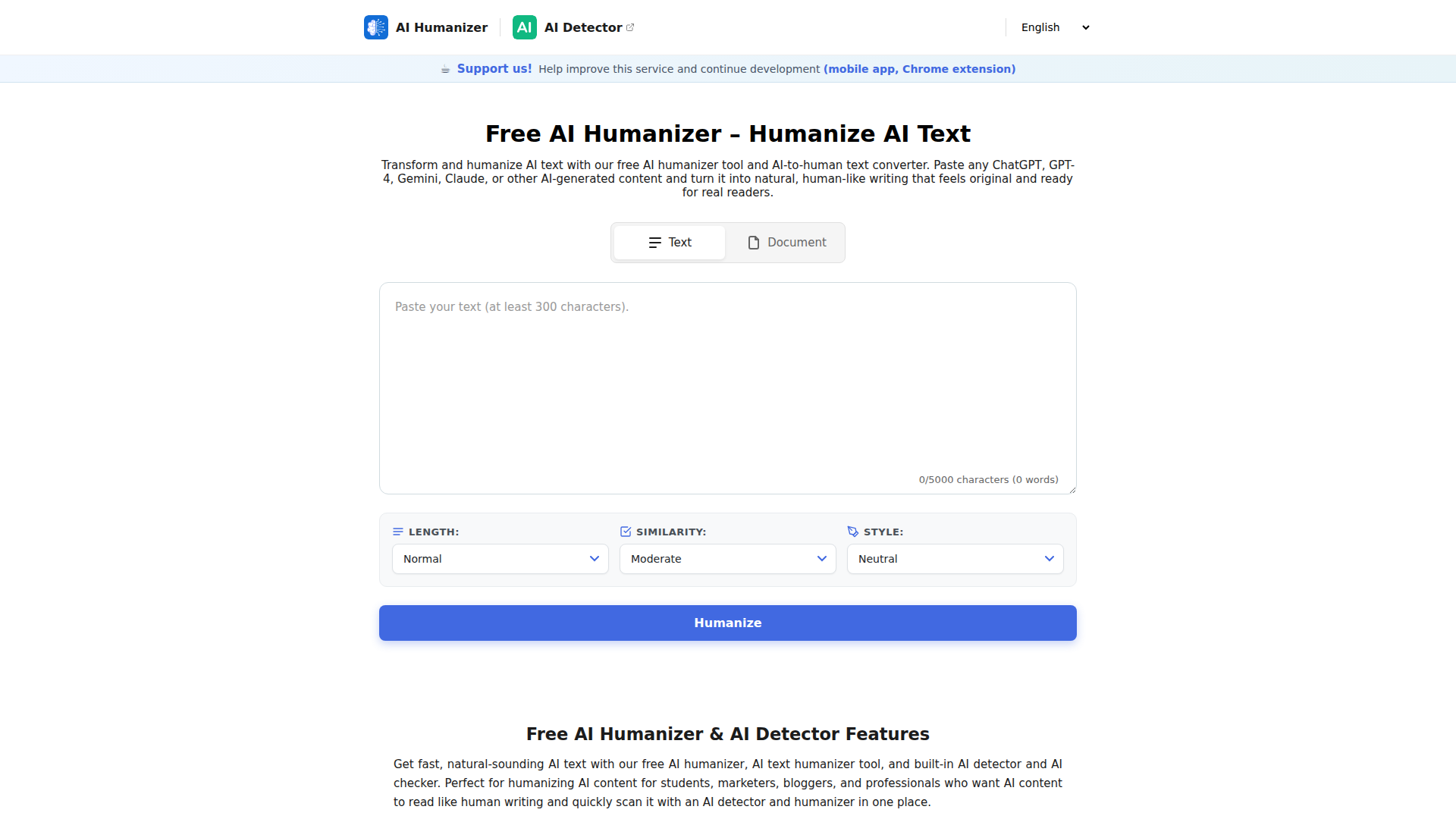 其核心流程很简单:粘贴 AI 生成的文本,选择长度和风格等设置,然后生成改写版本。页面将该产品定位为一款免费、轻量的 AI 草稿编辑与润色工具;其所属网站还内置了 AI 检测器,并规划了基于文档的工作流程,但这些功能目前尚未完全开放。