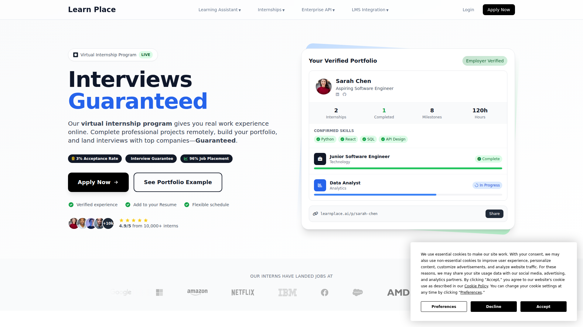 Learn Place 为学生、应届毕业生和转行人士提供由 AI 驱动的虚拟实习项目,面向那些需要可证明工作经验的人群。该产品定位为一种在线路径,用户可远程完成专业项目、接受结构化评审,并生成可供雇主验证的公开作品集。