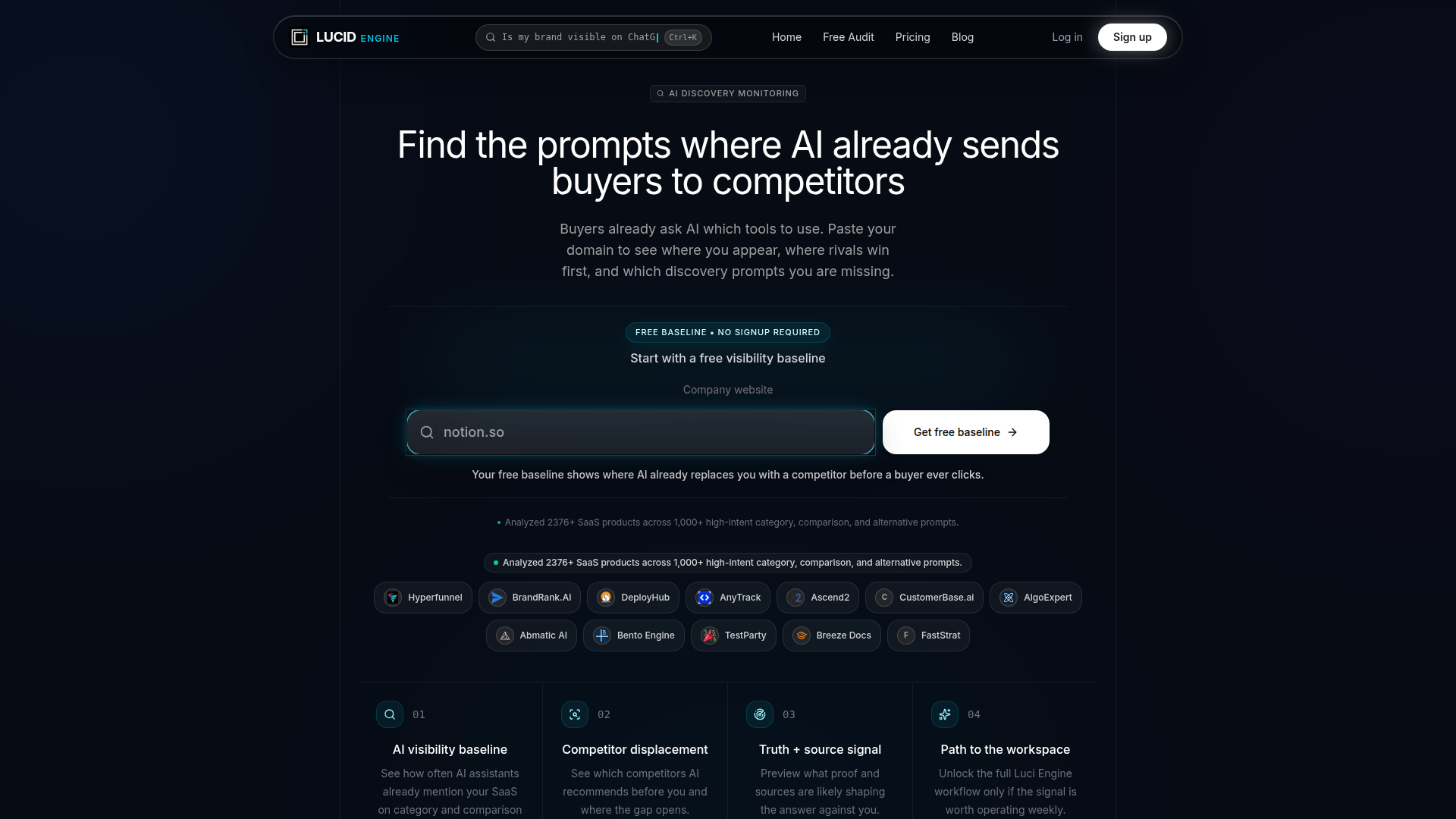 Lucid Engine 是一款 AI 发现监测产品,专注于品牌在 AI 助手中的可见性。它帮助企业检查:当买家提出高意向的品类、对比和替代方案相关提示时,自己的品牌是否会出现,以及 AI 是否转而推荐了竞争对手。
