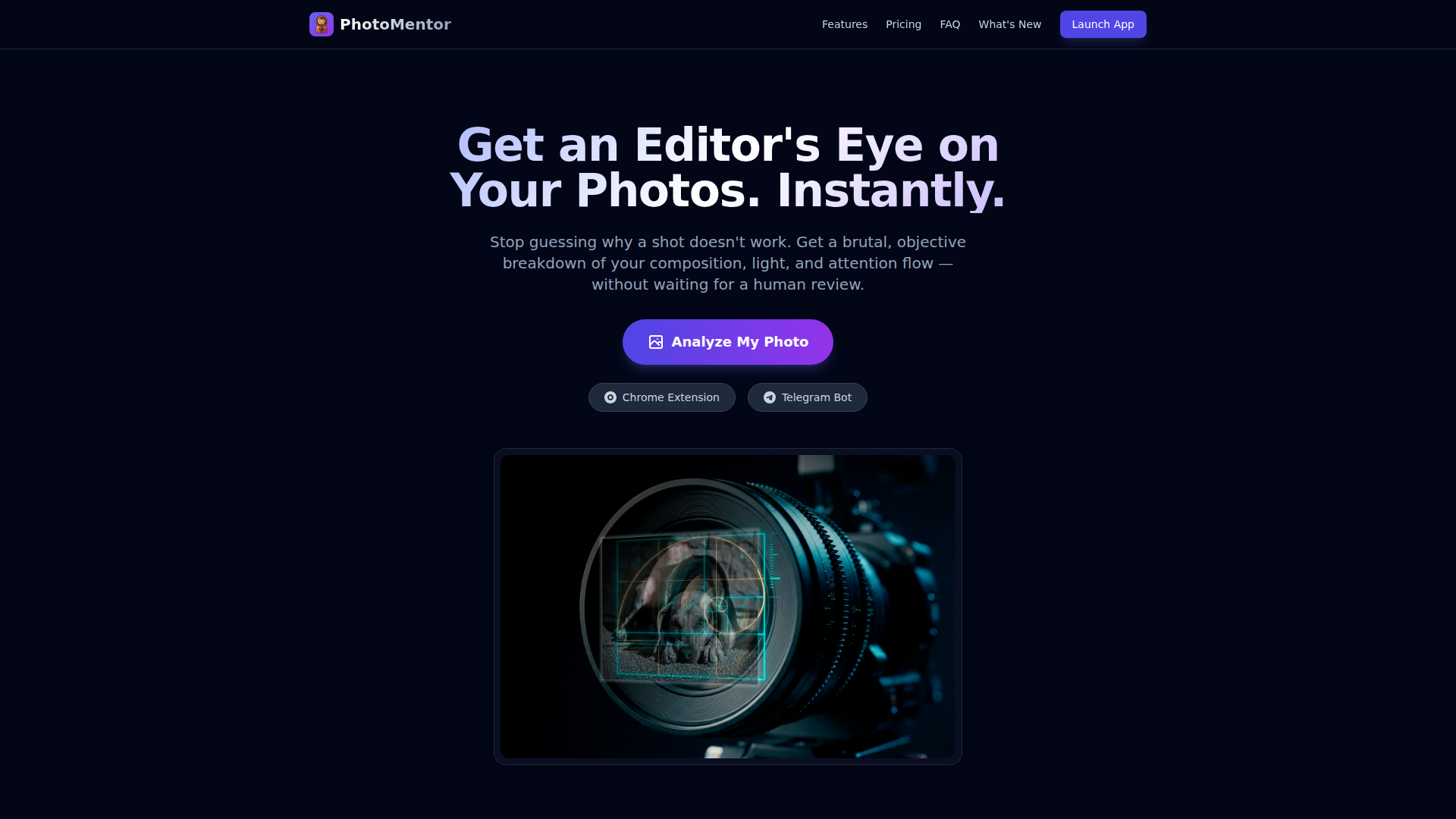 该产品显然面向初学者、摄影爱好者以及在职摄影师,他们希望获得比社交平台或人工审阅更快速、更客观的反馈。其当前定位是自助式点评助手和“第二意见”工作流,提供网页访问,以及 Chrome 扩展和 Telegram Bot 入口;面向专业人士的批量筛片功能则提到即将推出。