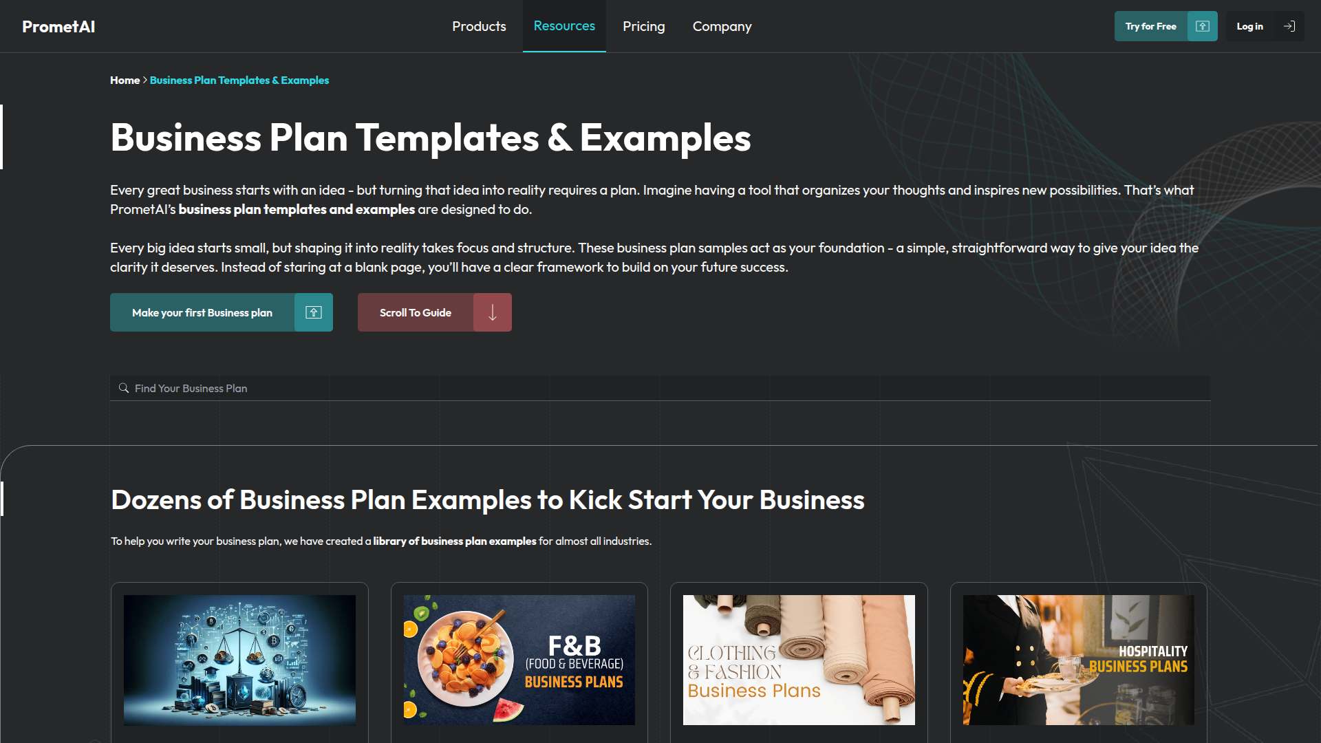 PrometAI 提供一个免费的商业计划书模板和示例库,旨在帮助创始人将早期想法转化为结构化的商业计划。该页面将这些模板定位为一种实用的起点,适合那些希望获得指导、而不是从空白页开始撰写计划的创业者。