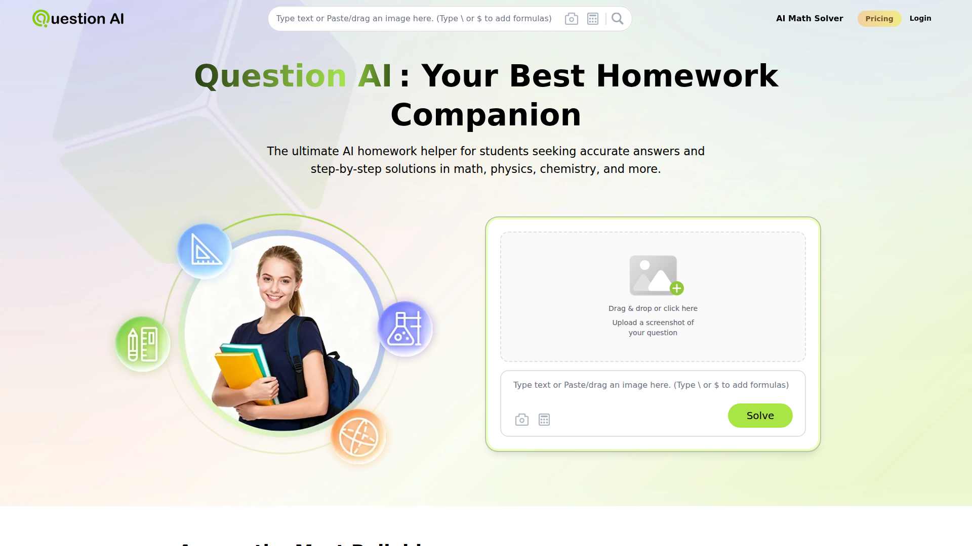 Question AI 是一款基于网页的 AI 作业助手,面向需要快速答案和分步讲解的学生,覆盖多个学校学科。页面将其描述为一体化学习工具,支持数学、科学、文学、历史、翻译和编程,并可通过文字提问或图像输入使用。