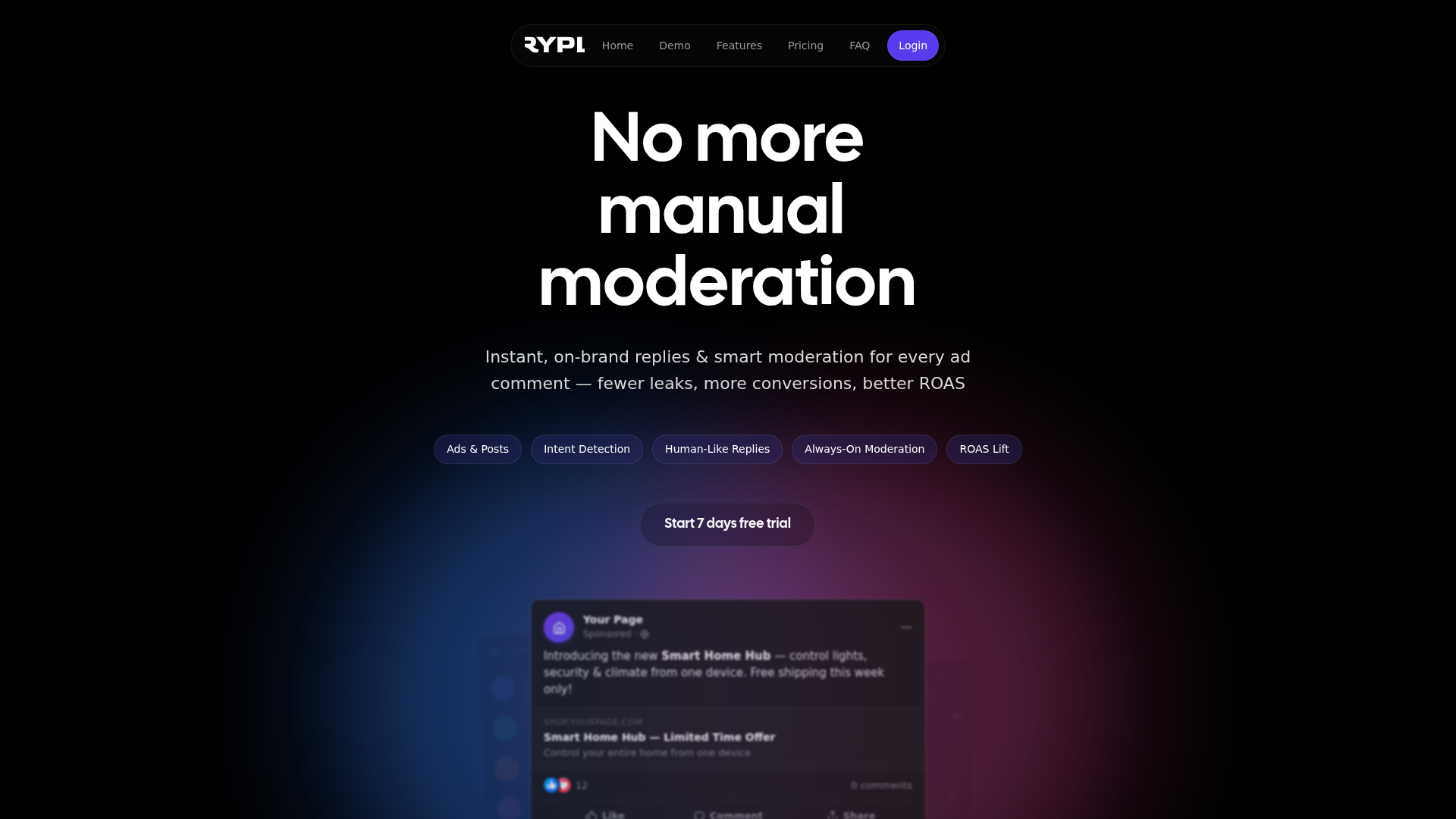 该产品的核心工作流围绕识别评论者意图、生成符合品牌风格的回复,以及在已连接的 Facebook 页面上持续进行评论审核展开。根据页面内容判断,Rypl 更可能被定位为专注于 Facebook 评论自动化的一层工具,而非广泛的社交媒体管理套件。