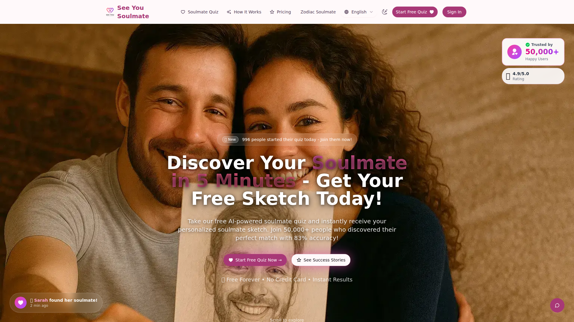 See You Soulmate 是一款面向消费者的 AI 测验产品,可根据用户回答生成个性化的“灵魂伴侣画像”和匹配档案。该网站将其定位为一种快速、可免费开始的体验,面向希望获得恋爱契合度指导的人群,结合了人格分析、占星、面相解读以及其所称的业力爱情指导。