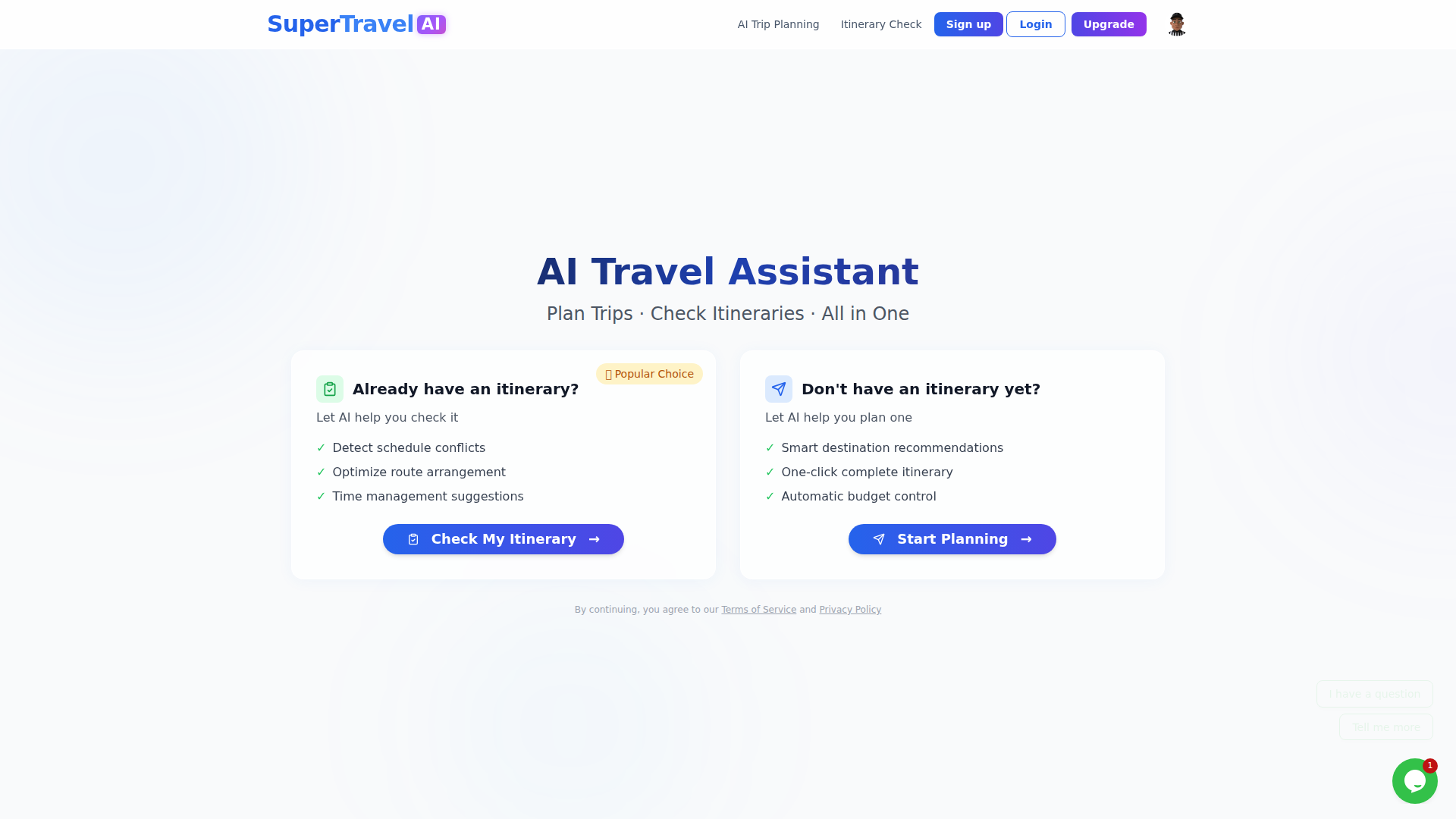 SuperTravel 是一款 AI 旅行规划产品,帮助旅行者从零开始创建行程,或审核现有行程。页面展示了两大主要流程:“开始规划”用于创建包含目的地推荐和预算控制的完整计划;“检查我的行程”用于分析已拟定的行程,识别冲突、路线问题和时间安排问题。