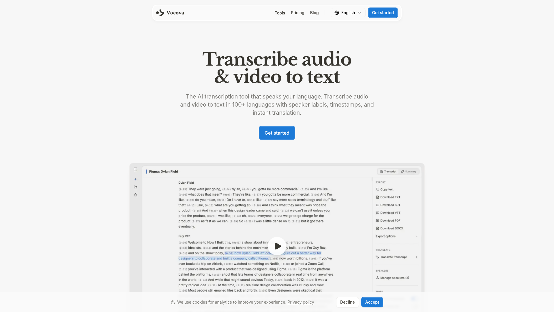 Vocova 是一款基于浏览器的 AI 转录工具,可将音频和视频转换为文本。它支持 100 多种语言的转录、140 多种语言的翻译、说话人标注、时间戳、行内编辑、摘要,以及导出为常见文档和字幕格式。